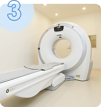 A. CT検査とはX線を人体に照射し通過してきたX線の強弱を検出器で収集し、そのデータをコンピューターが計算・解析を行うことで様々な画像を作り出す検査です。全身の撮影が可能で、心臓・大動脈・気管支・肺などの胸部、肝臓や腎臓や膵臓や大腸などの腹部の病変に関しては、優れた画像評価が行えます。